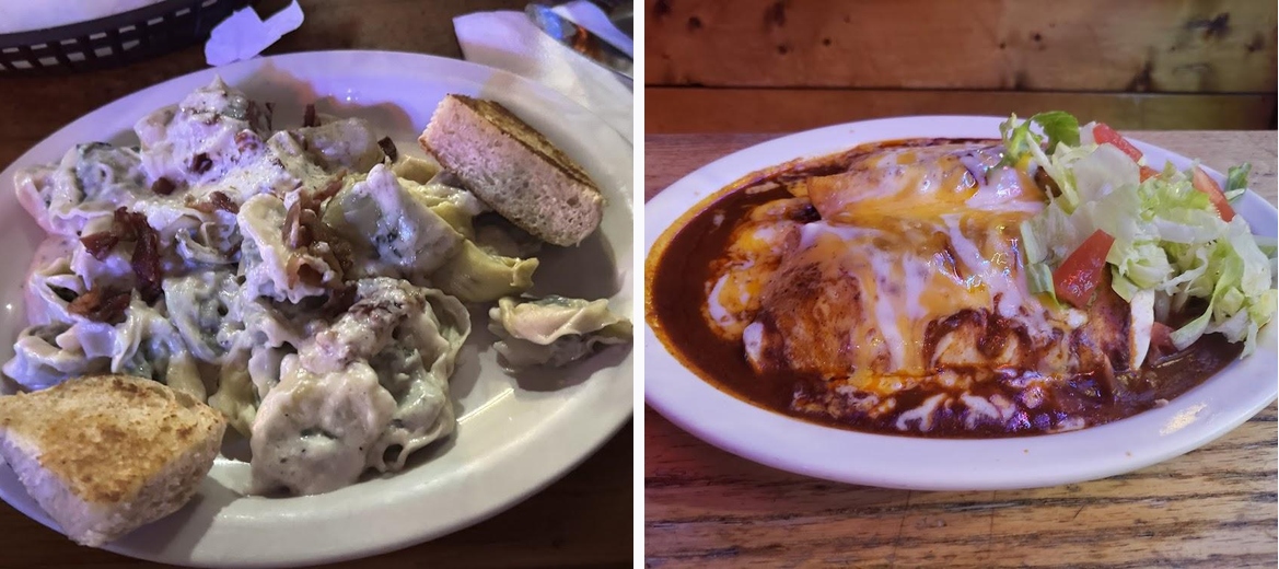 We came on a Saturday night and the bar was full but all the tables were empty. I had been here 10 years earlier and the pizza was great! We ordered the bacon cheeseburger bombs, the steak and shrimp Alfredo, the spinach and bacon tortellini and my son had enchiladas. The steak was so tender, the bacon amped up the tortellini dish and my son was raving about the Mexican! The women’s bathroom made us laugh! There was a barstool right next to the commode, the toilet was elevated so someone short would be on their tiptoes and the mirror was hanging. It was a great experience and the food and service were top notch!!!